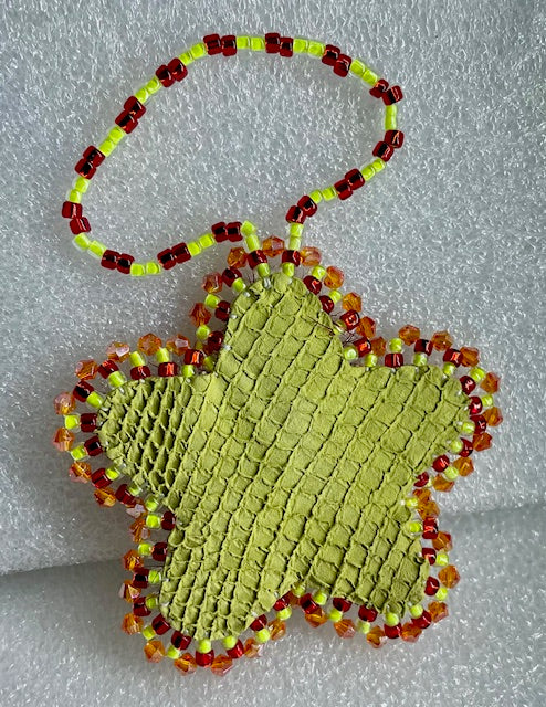 Matching or contrasting beaded sealskin and salmon leather designs, styled with various beads surrounding haired seal hide and salmon leather backing.
